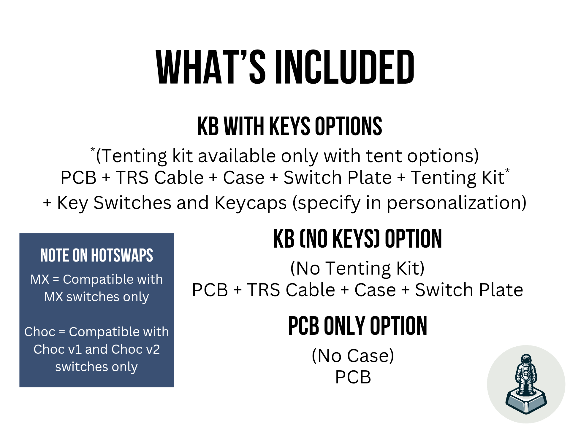 Note that for any one of these options, you can only select a keyboard that has MX hotswaps or Choc hotswaps. MX hotswap keyboards only supports MX switches, and Choc hotswap keyboards only supports Choc v1 and Choc v2 switches.